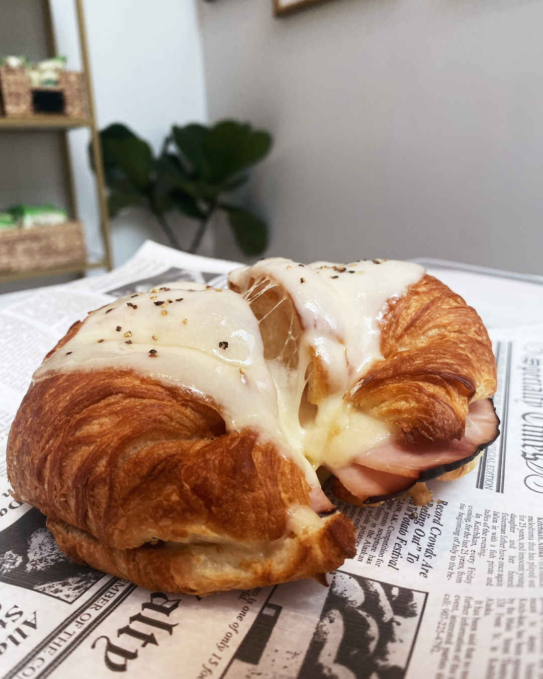 Croque Monsieur on a large croissant with ham, melted swiss cheese, tomato, and bechamel. Oven grilled